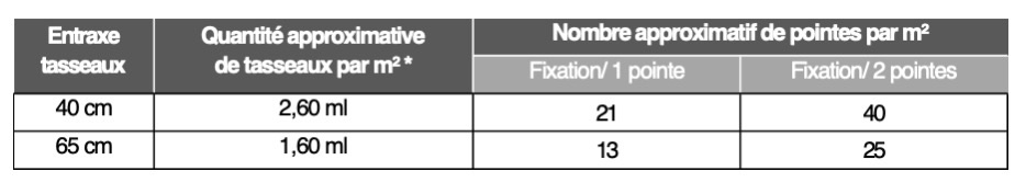 Épaisseur ≥ 21 mm et largeur ≥ 60 mm - Fixation avec 2 pointes par appui et entraxes des appuis ≤ 65 cm.