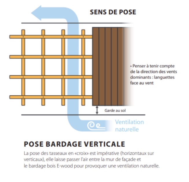 La mise en œuvre s’effectue sur des tasseaux horizontaux espacés de 65 cm au maximum selon la technique du double tasseautage (voir Figure). Les lames verticales sont protégées en tête et sont découpées en forme de larmier en partie basse